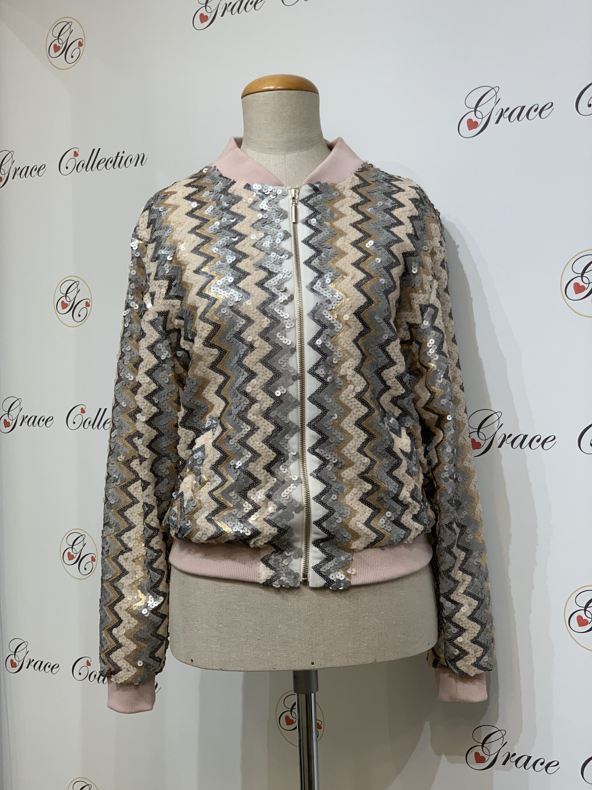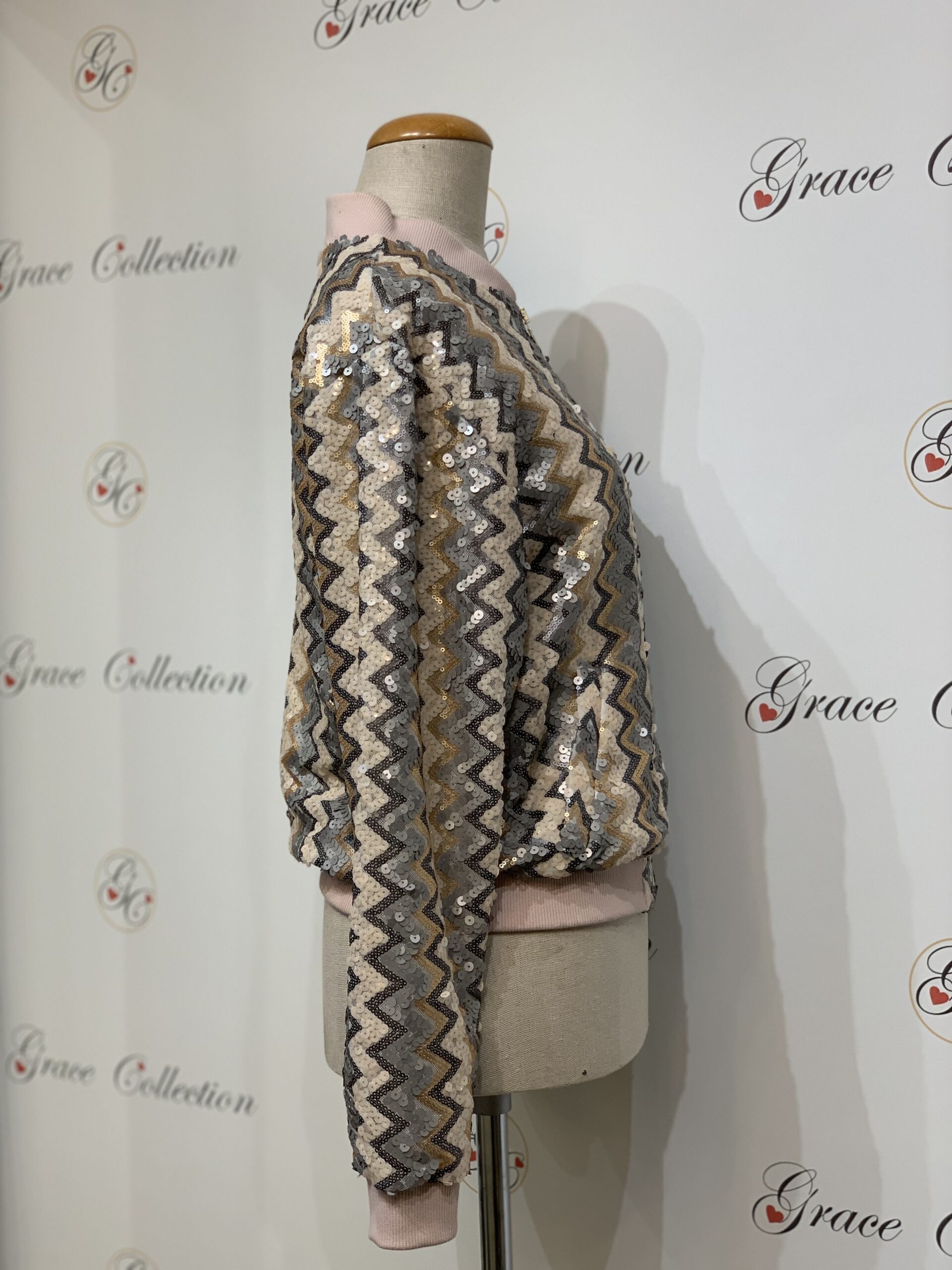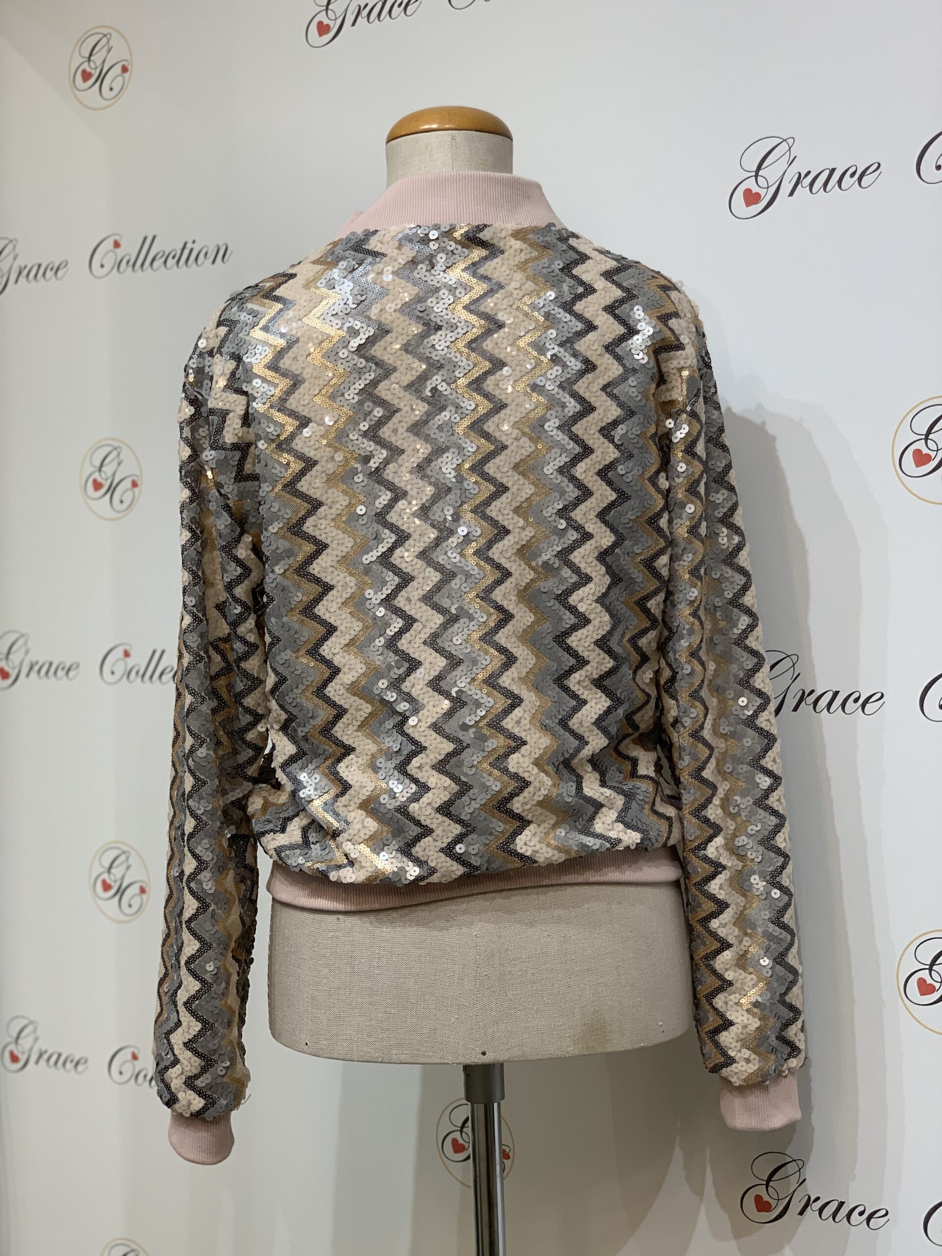 Bomberka cekinowa w kolorach pastelowych, z różowymi elementami i elastycznymi ściagaczami przy rękawach i talii.