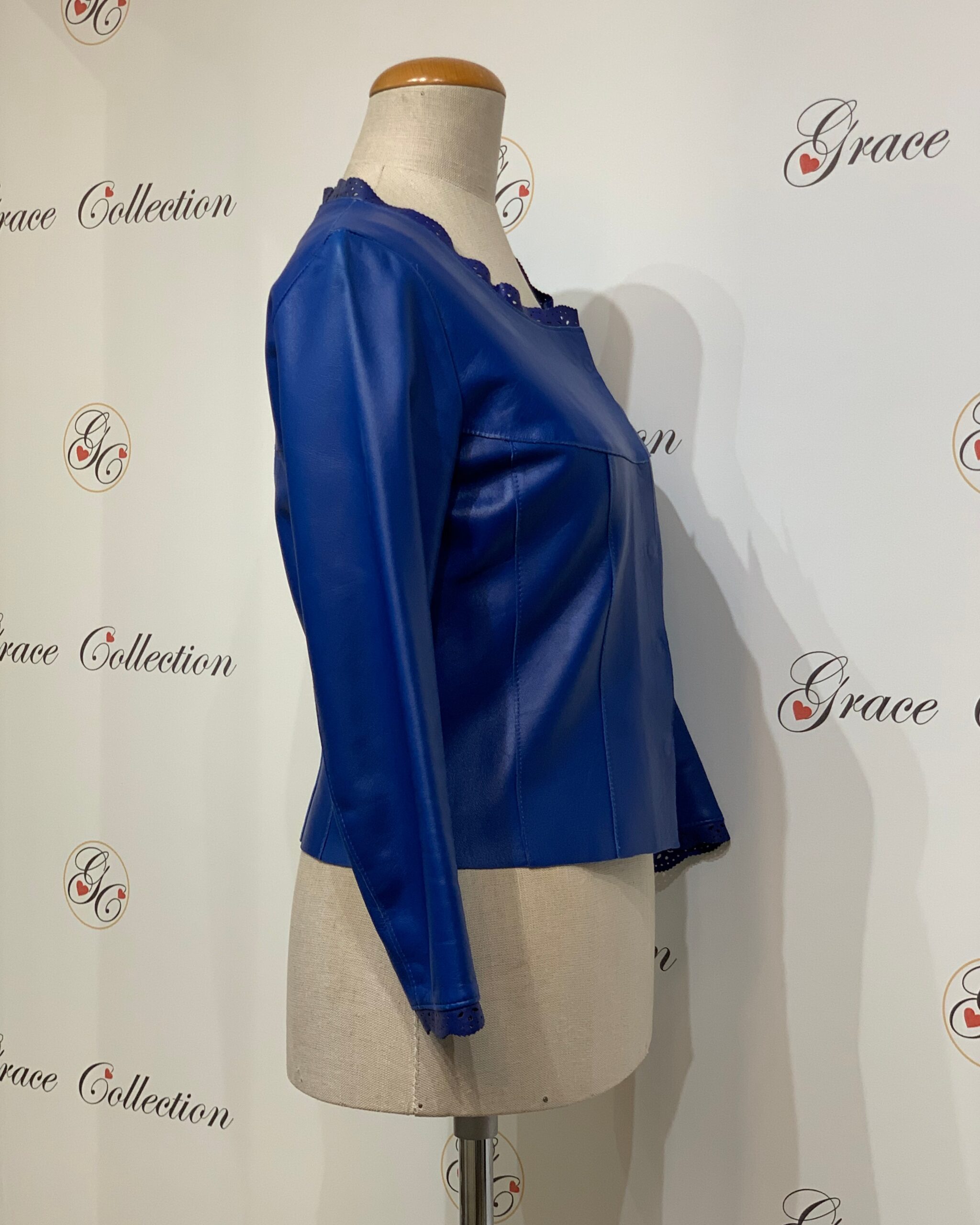 Chabrowa krótka kurtka zapinana na zatrzaski z ozdobnymi elementami ze skórzanej koronki. Dopasowana przy talii i modelująca sylwetkę.