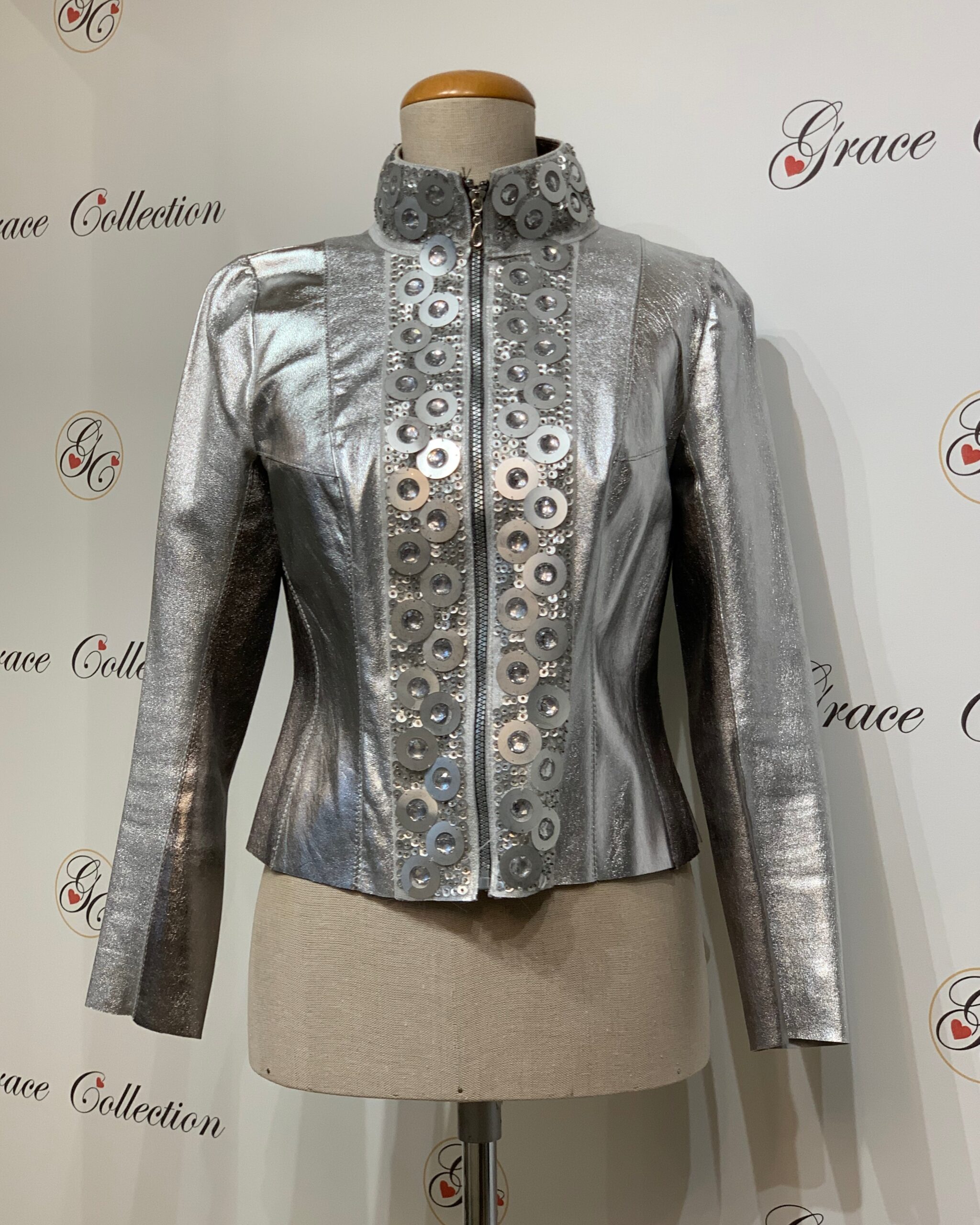 Krótka srebrna kurtka o wysokim kołnierzu i ozdobami przy zamku. Dopasowana przy talii i modelująca sylwetkę.