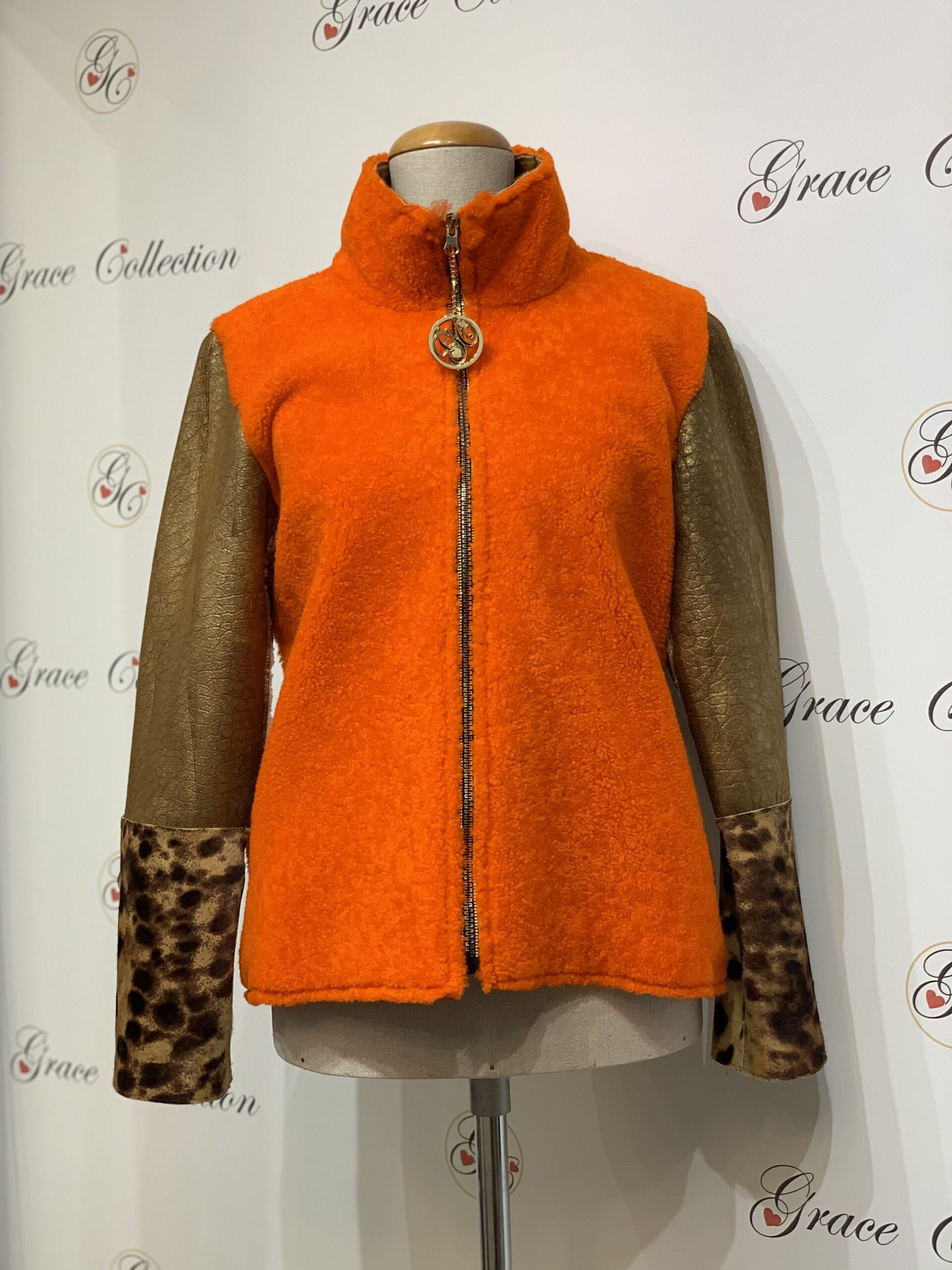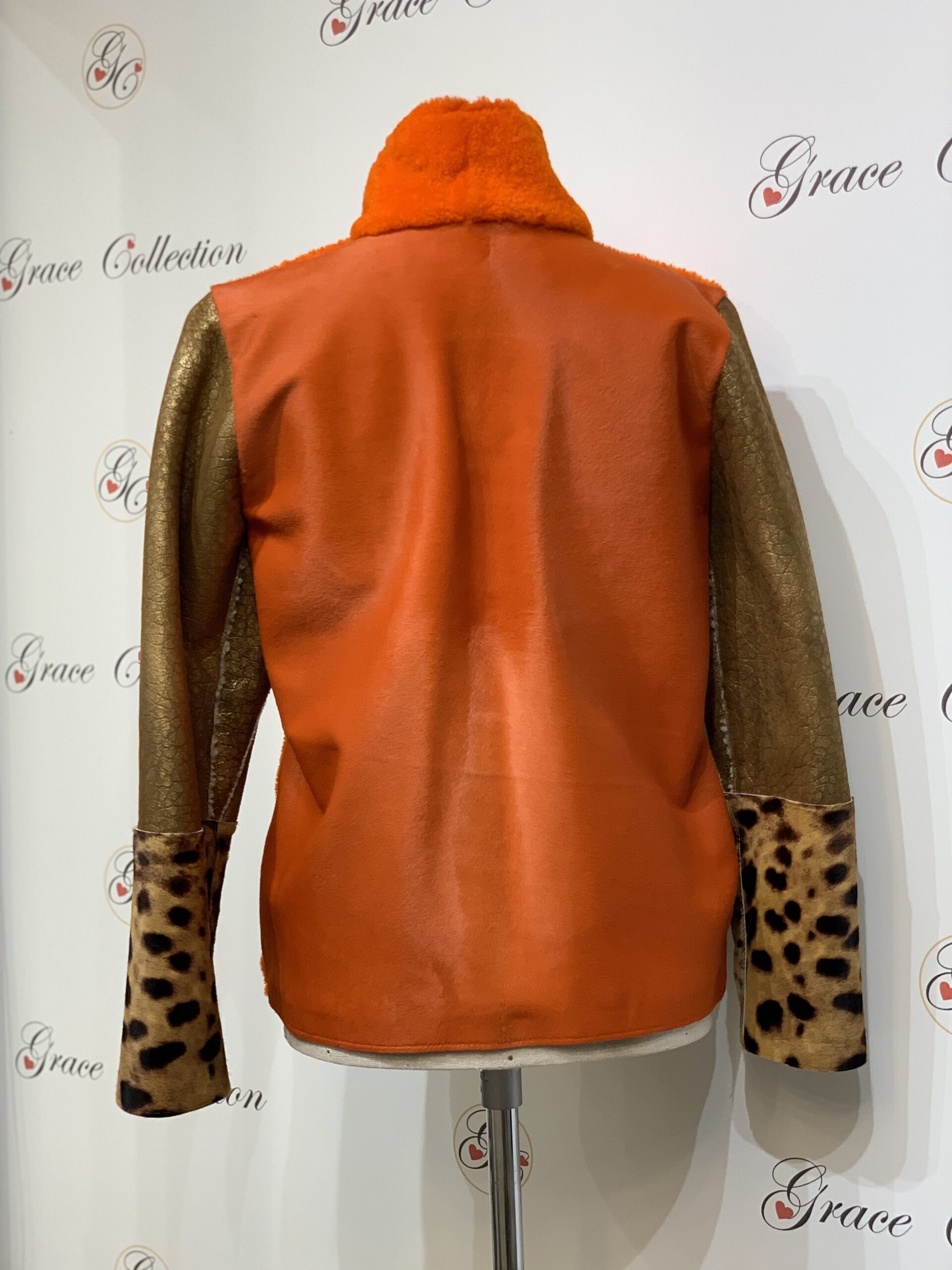 Kurtka kożuszek, pomarańczowy kolor, rękawy z kolorze starego złota, stójka oraz mankiety wykończone ze skóry z printem panterki. Zapinana na zamek błyskawiczny. Miękka, lekka, ciepła i wygodna.