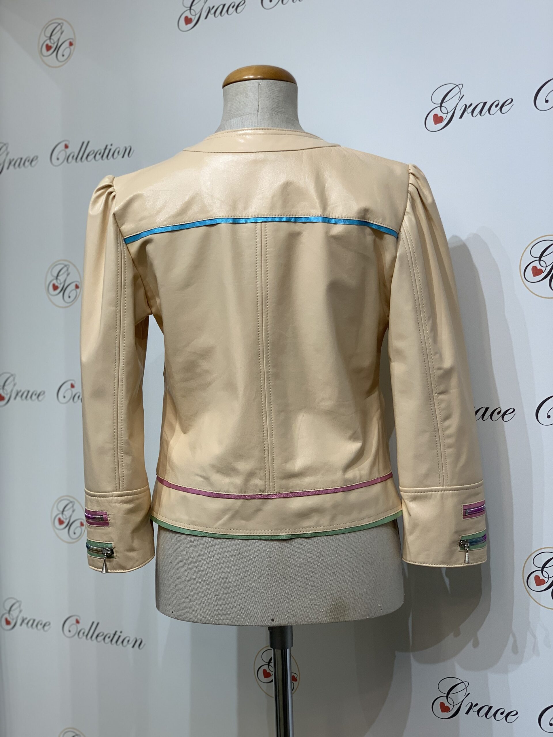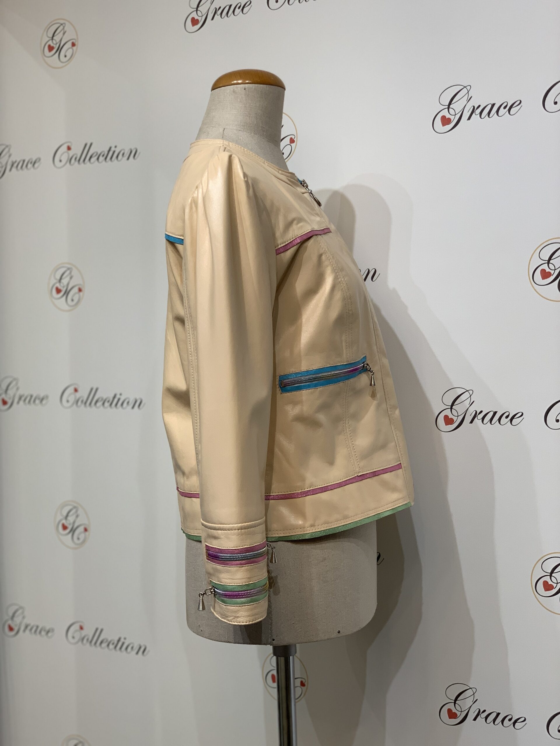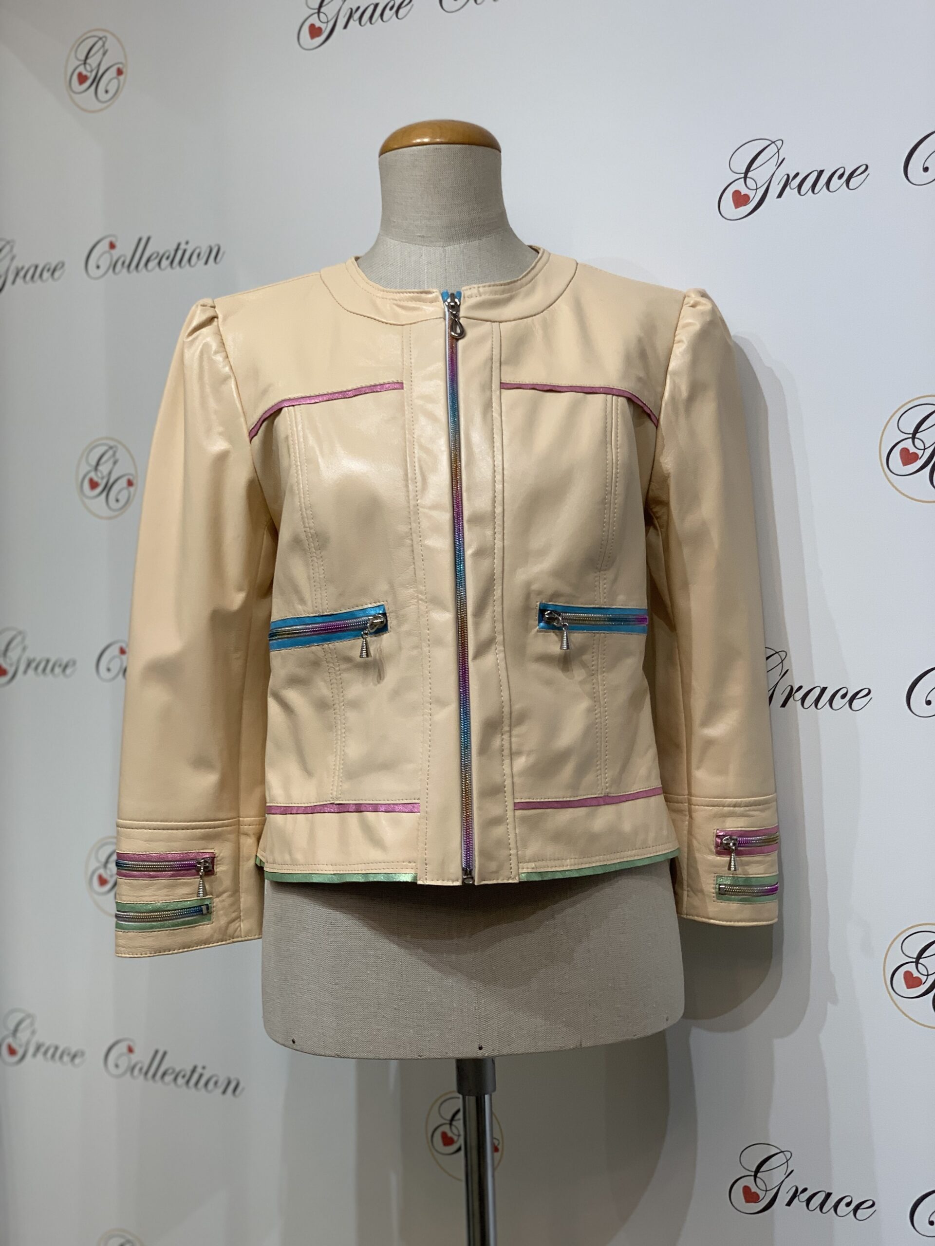 Kurtka krótka w pastelowych kolorach z lekko bufiastymi rękawami i kolorowymi dodatkami. Posiada wiele ozdobnych zamków w kolorze skórzanych wypustek.