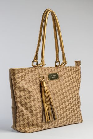 Torebka skórzana typu shopperka – przód we wzór „kurzej łapki”, a tył w kolorze przecieranego starego złota, mieszcząca bez problemu laptop wraz z dokumentami i innymi większymi, niezbędnymi przedmiotami. Góra torby zapinana na zamek błyskawiczny.  Prosta i szykowna kobieca elegancja casualowa.