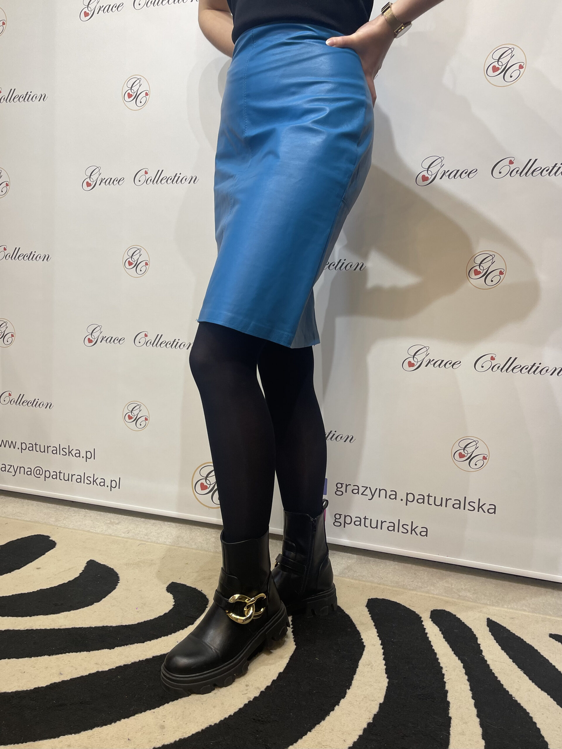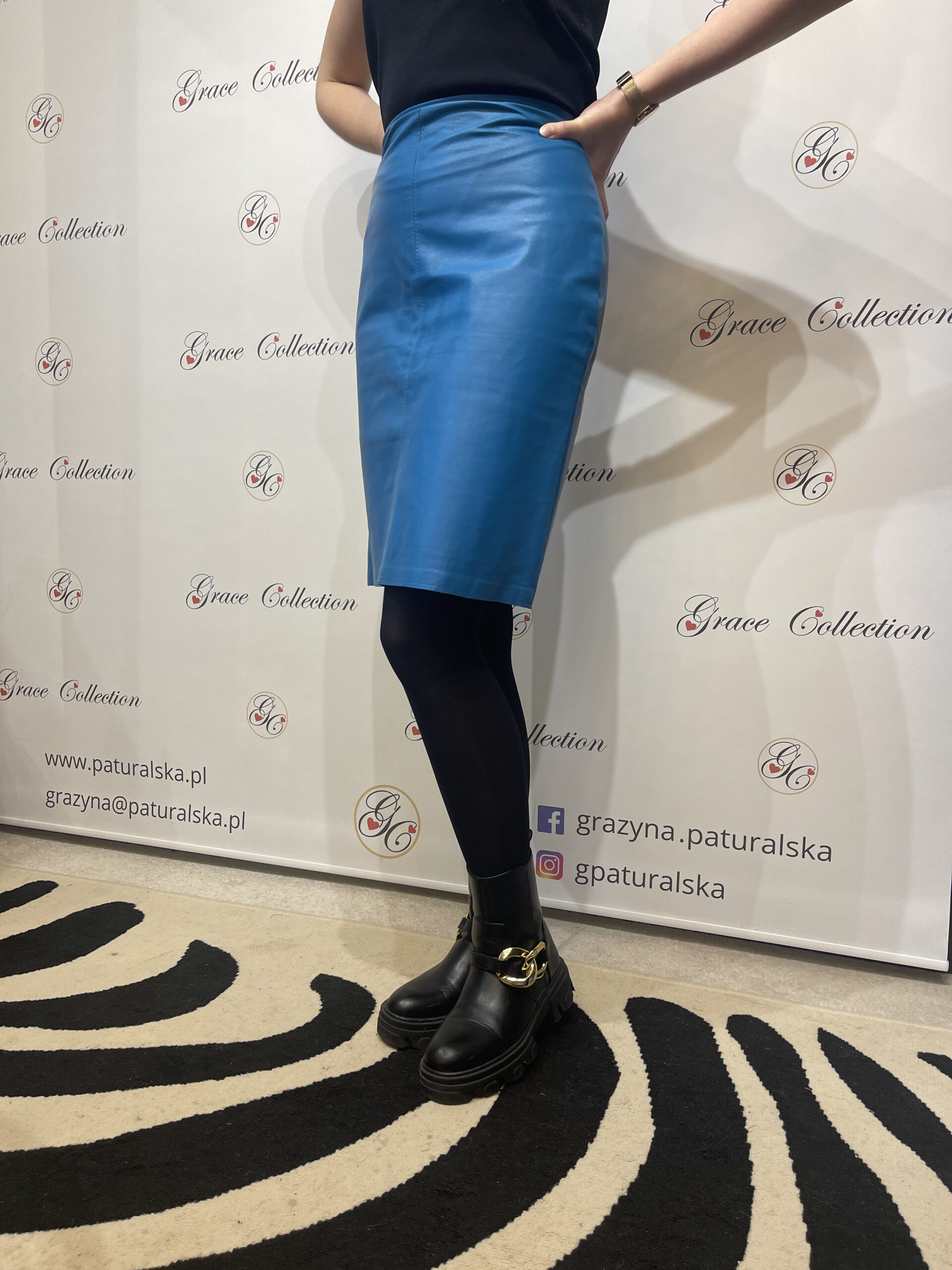 Spódniczka ołówkowa z naturalnej skory licowej, bardzo miękkiej i wygodnej w kolorze turkusowym. Wysoki stan, dopasowany krój, z tyłu rozporek zapinany na zamek.
