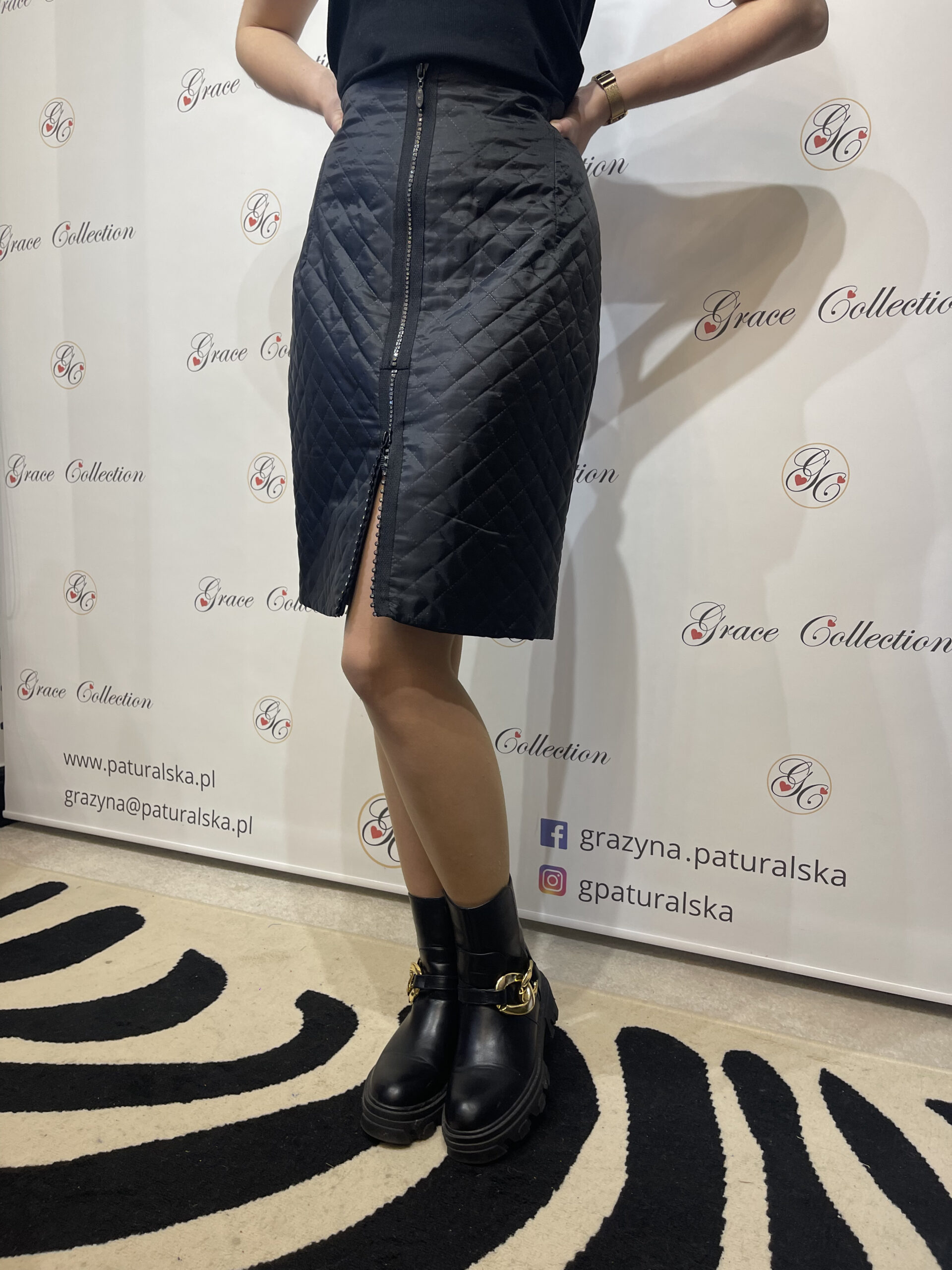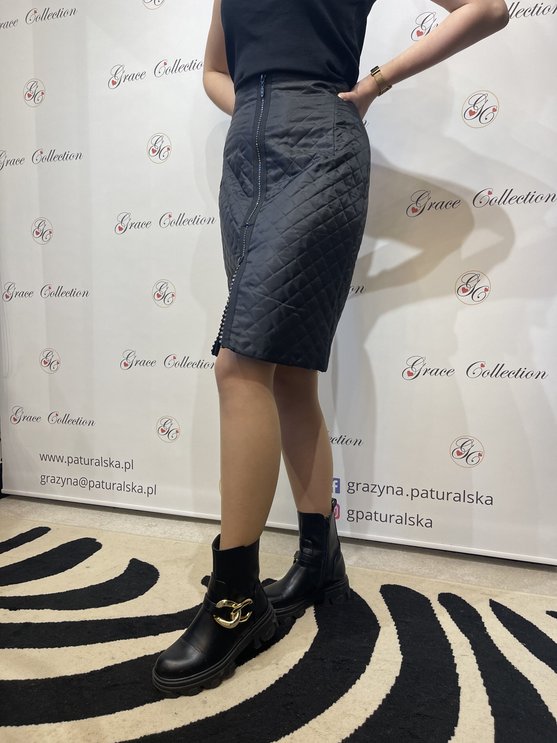 Spódniczka ołówkowa z, bardzo miękkiej i wygodnej ocieplanej pikówki, w kolorze czarnym. Wysoki stan, dopasowany krój, zapinana na całej długości na zamek ozdobny z kryształkami. Zamek można nosić z tyłu lub z przodu.