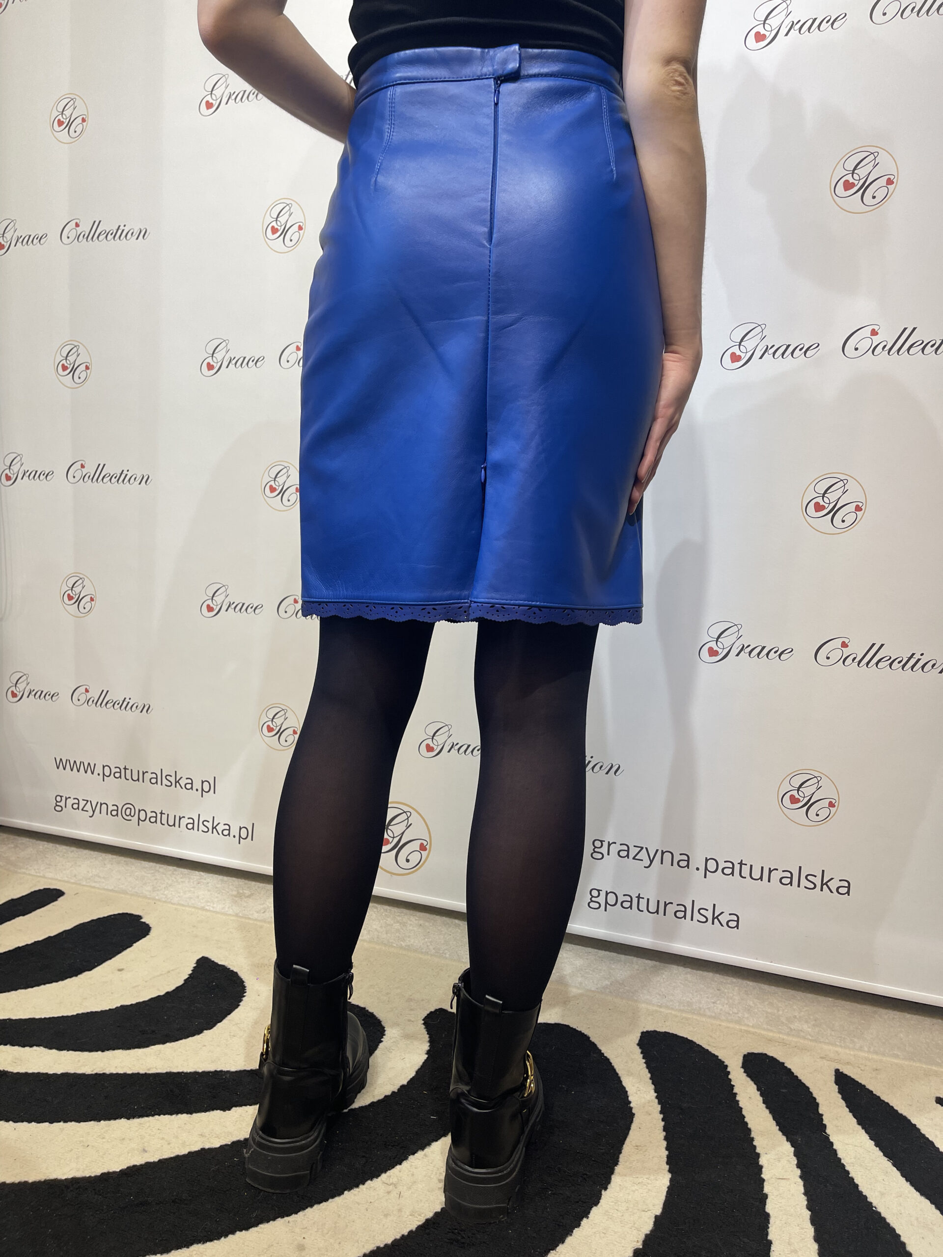 Spódniczka ołówkowa z naturalnej skory licowej, bardzo miękkiej i wygodnej w kolorze chabrowym. Wysoki stan, dopasowany krój, z tyłu rozporek zapinany na zamek. Dół spódniczki wykończony perforowaną koronką skórzaną.