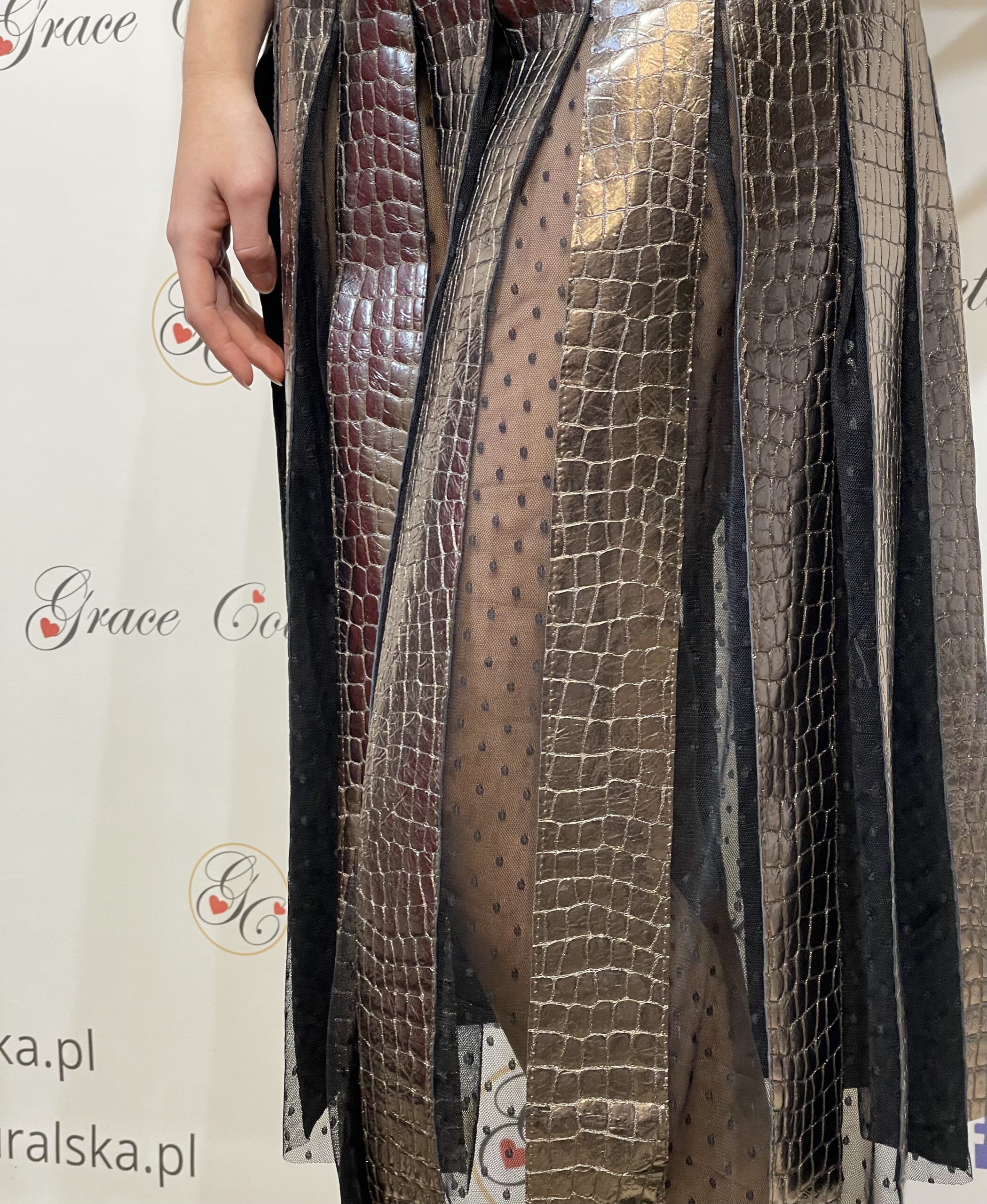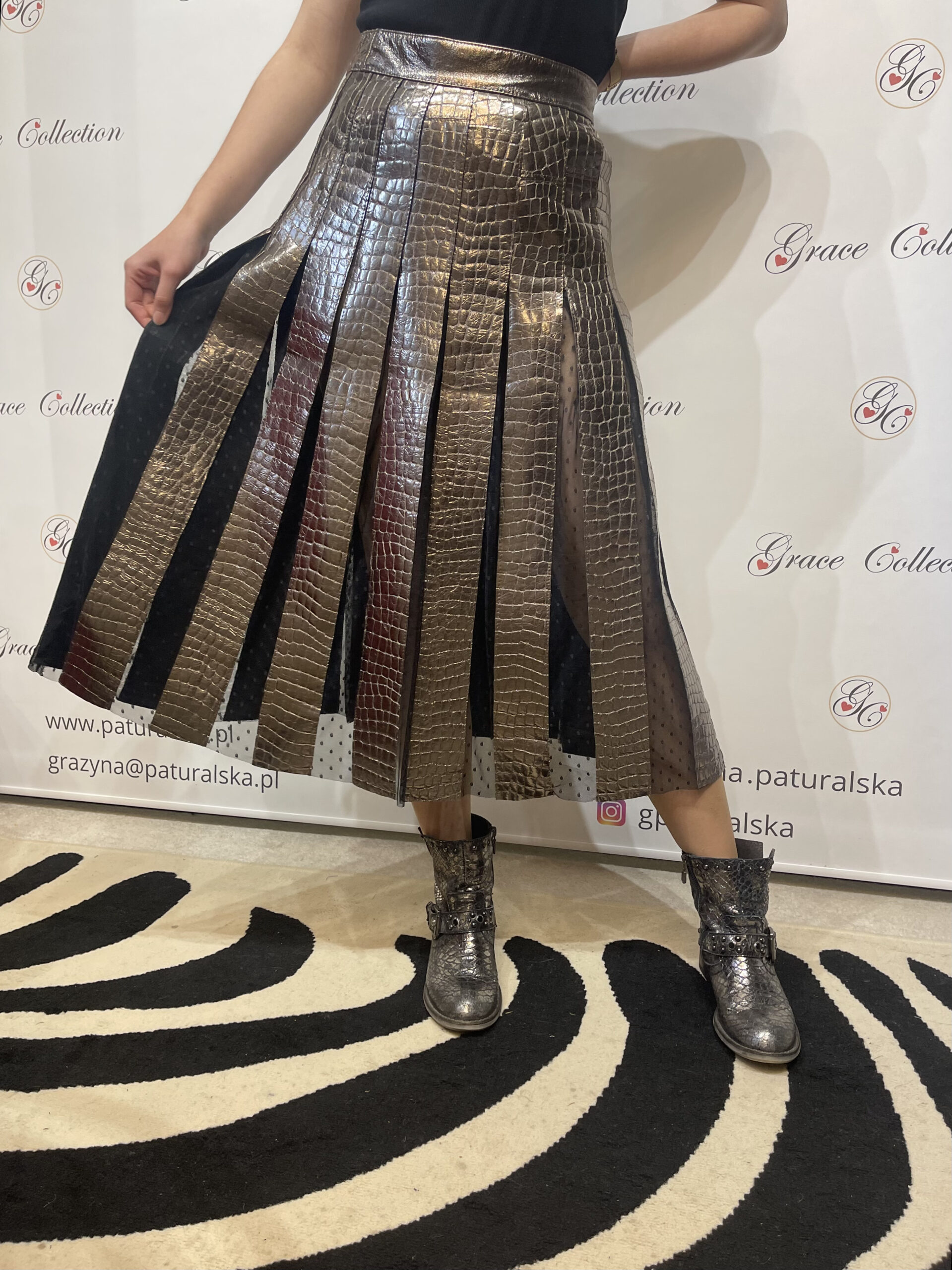 Spódnica midi trapezowa, z naturalnej skory licowej z tłoczonym wzorem zwierzęcym, w połyskliwym kolorze miedzianym. Wysoki stan, dopasowany krój podkreślający talię, dół rozkloszowany, skóra cięta w długie, wąskie prostokąty, imitujące fały, naszywane na delikatną siateczkę koronkową z kolorze czarnym, tworzącą seksowny prześwit między naszytymi paskami skóry. Spódnica może być wykonana w wielu wybranych przez zamawiającą kolorach.