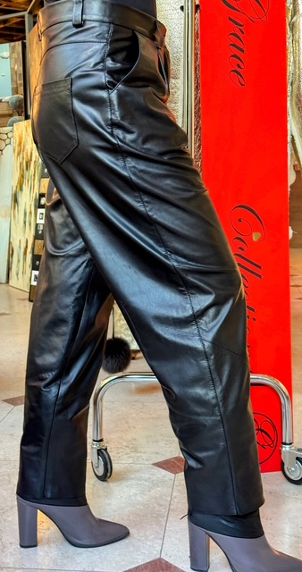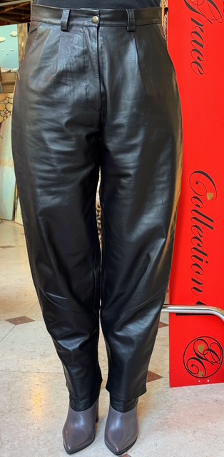 Spodnie ze skóry naturalnej typu „banan”, w czarnym kolorze, wysoki stan z paskiem, zamek błyskawiczny. Wygodne, miękka skóra pięknie się układa do sylwetki. Idealne do noszenie z topikiem, marynarką bądź swetrem.