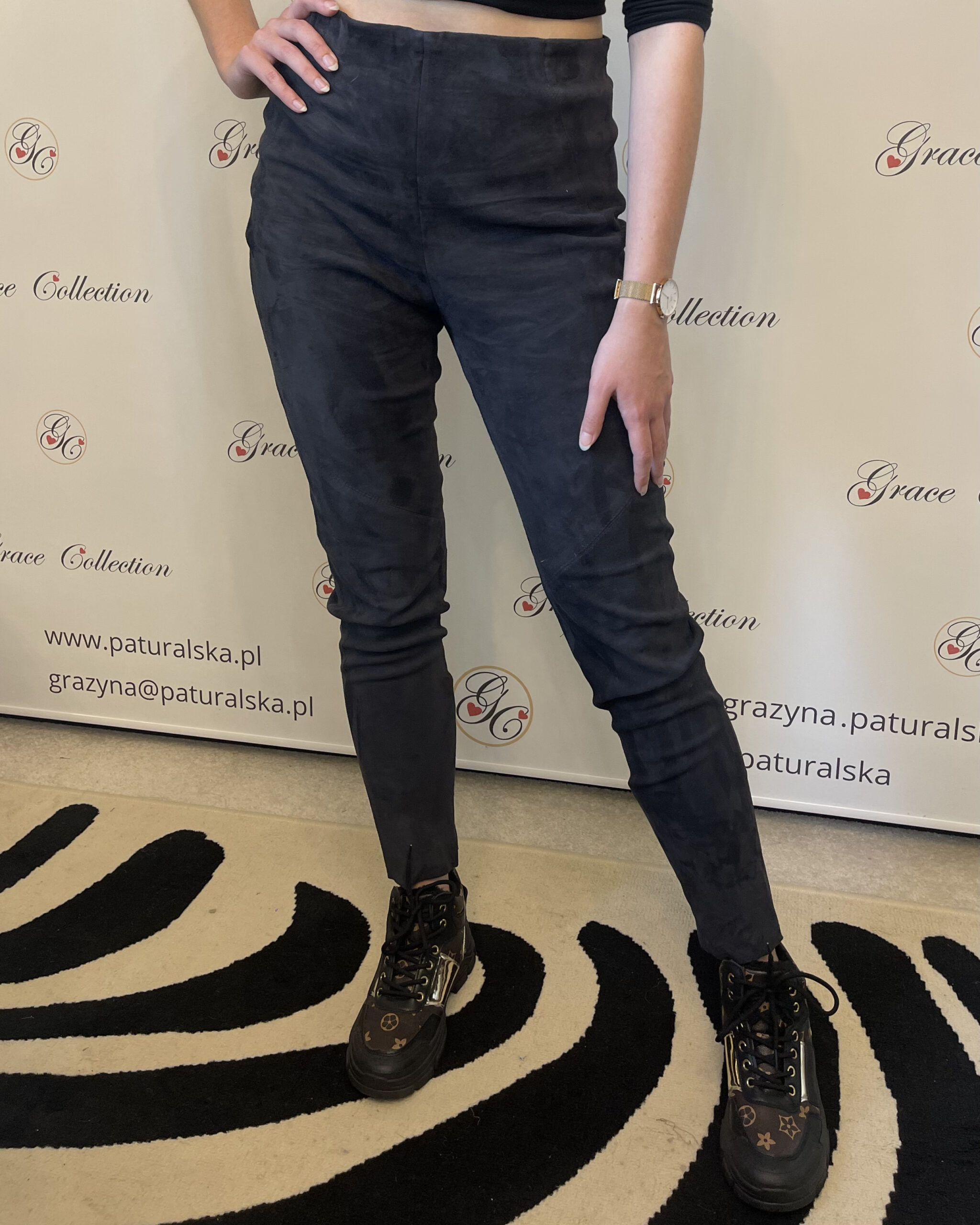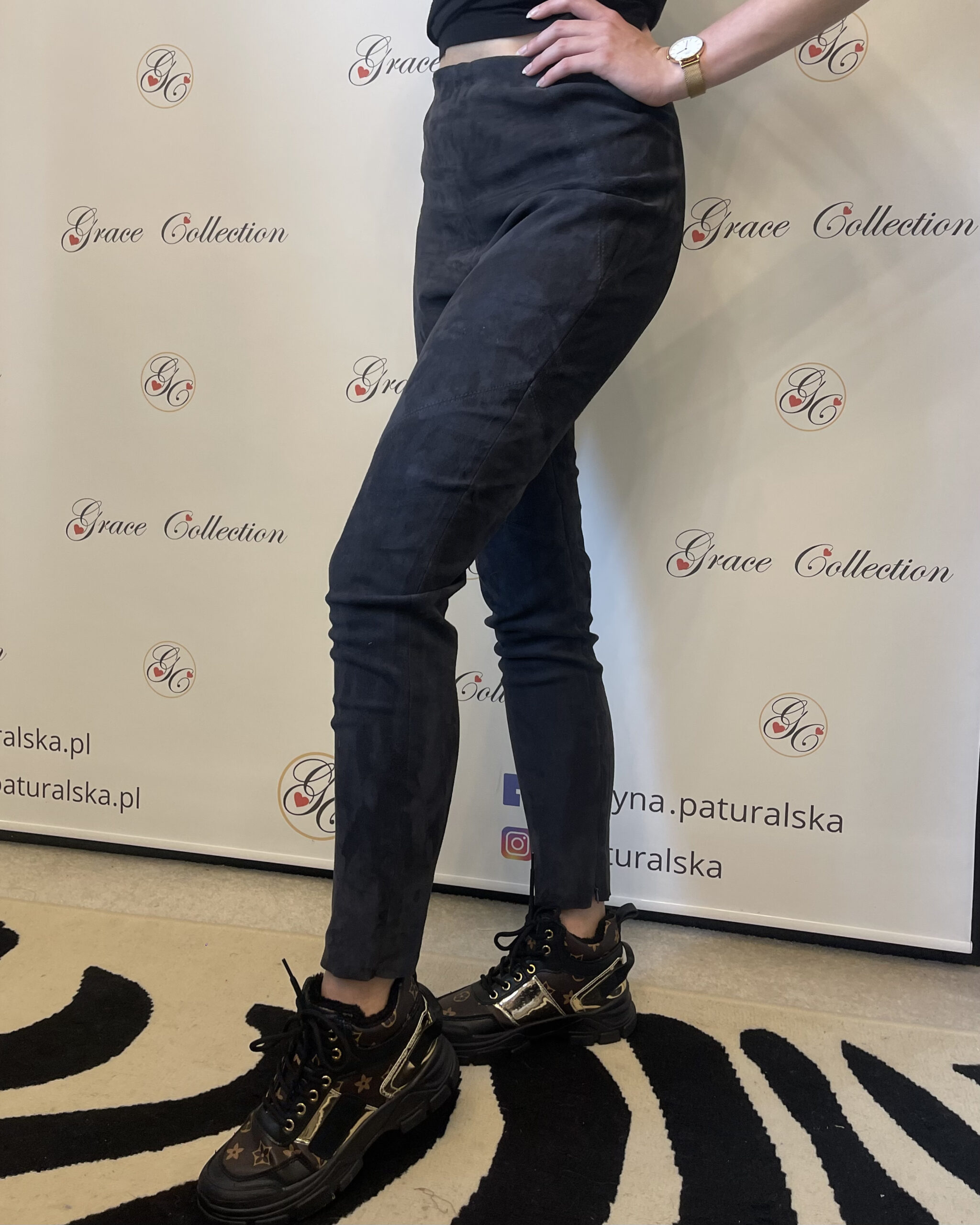 Spodnie z bardzo miękkiej i elastycznej naturalnej skóry welurowej na stretchu w kolorze grafitowym. Zwężane nogawki, wysoki stan.