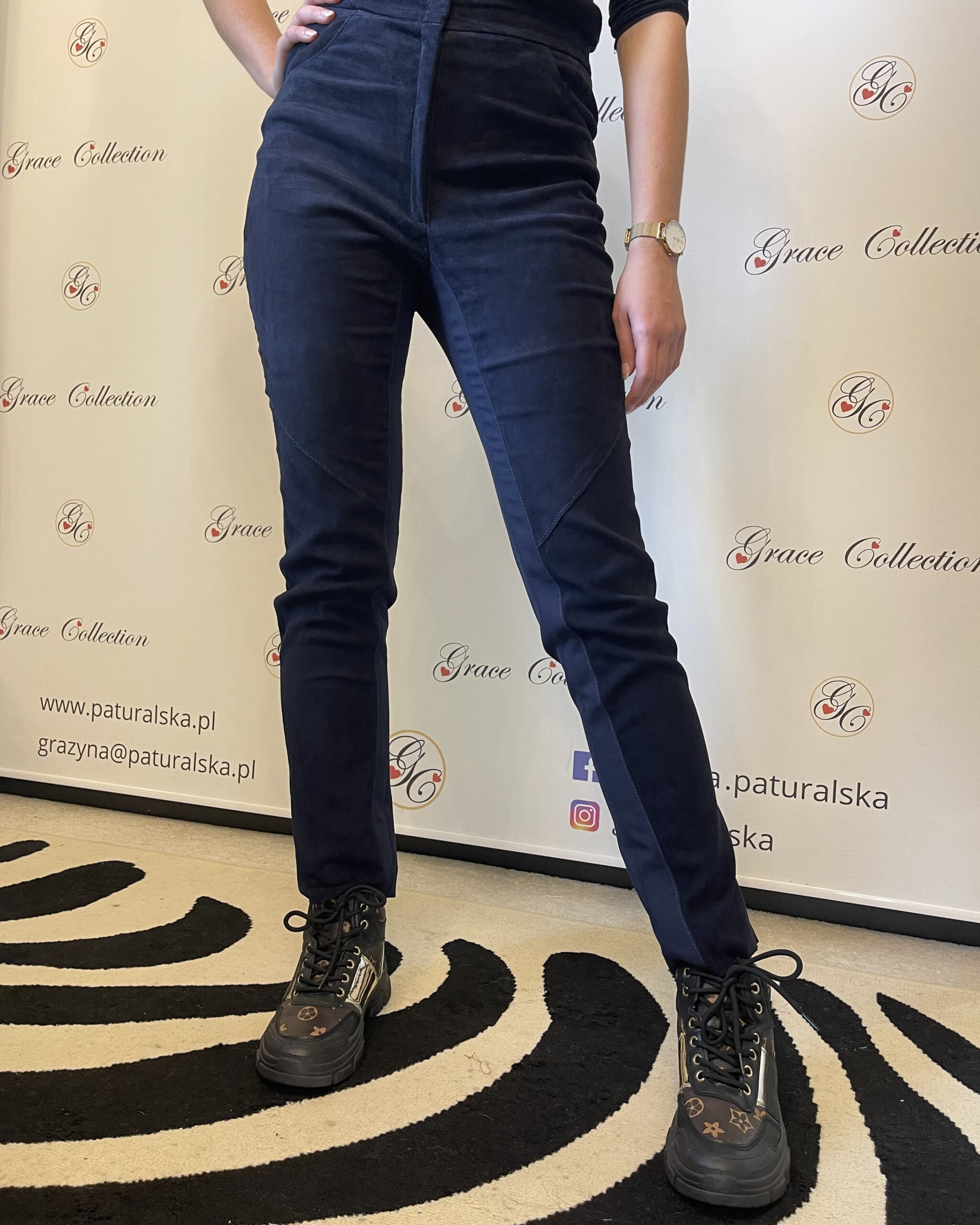 Spodnie z z bardzo miękkiej i elastycznej naturalnej skóry welurowej na stretchu w granatowym kolorze z przodu, tył z mięsistej tkaniny stretchowej w granatowym kolorze. Tylne kieszenie ze skóry welurowej. Zwężane nogawki, wysoki stan zapinany na zamek.