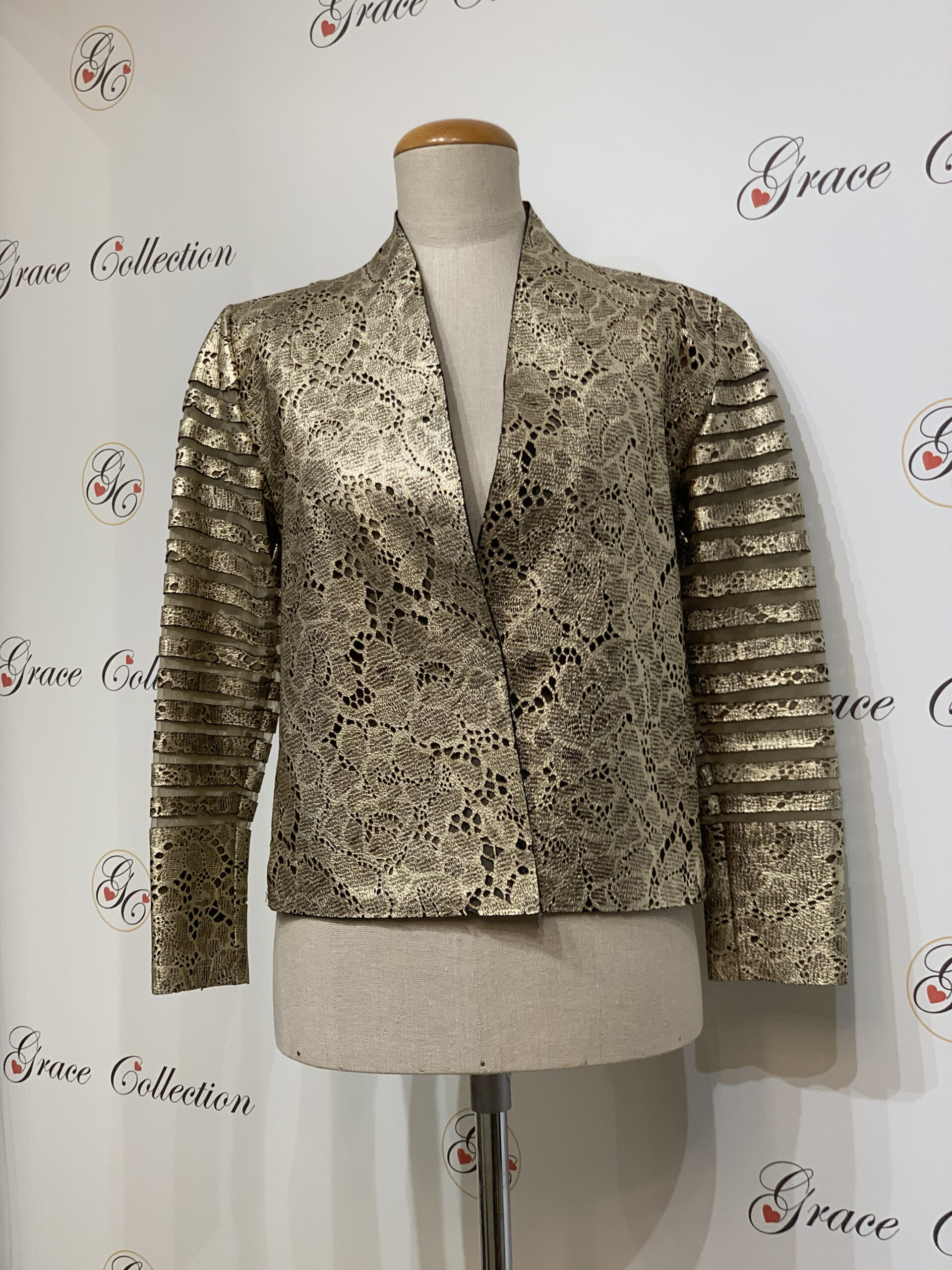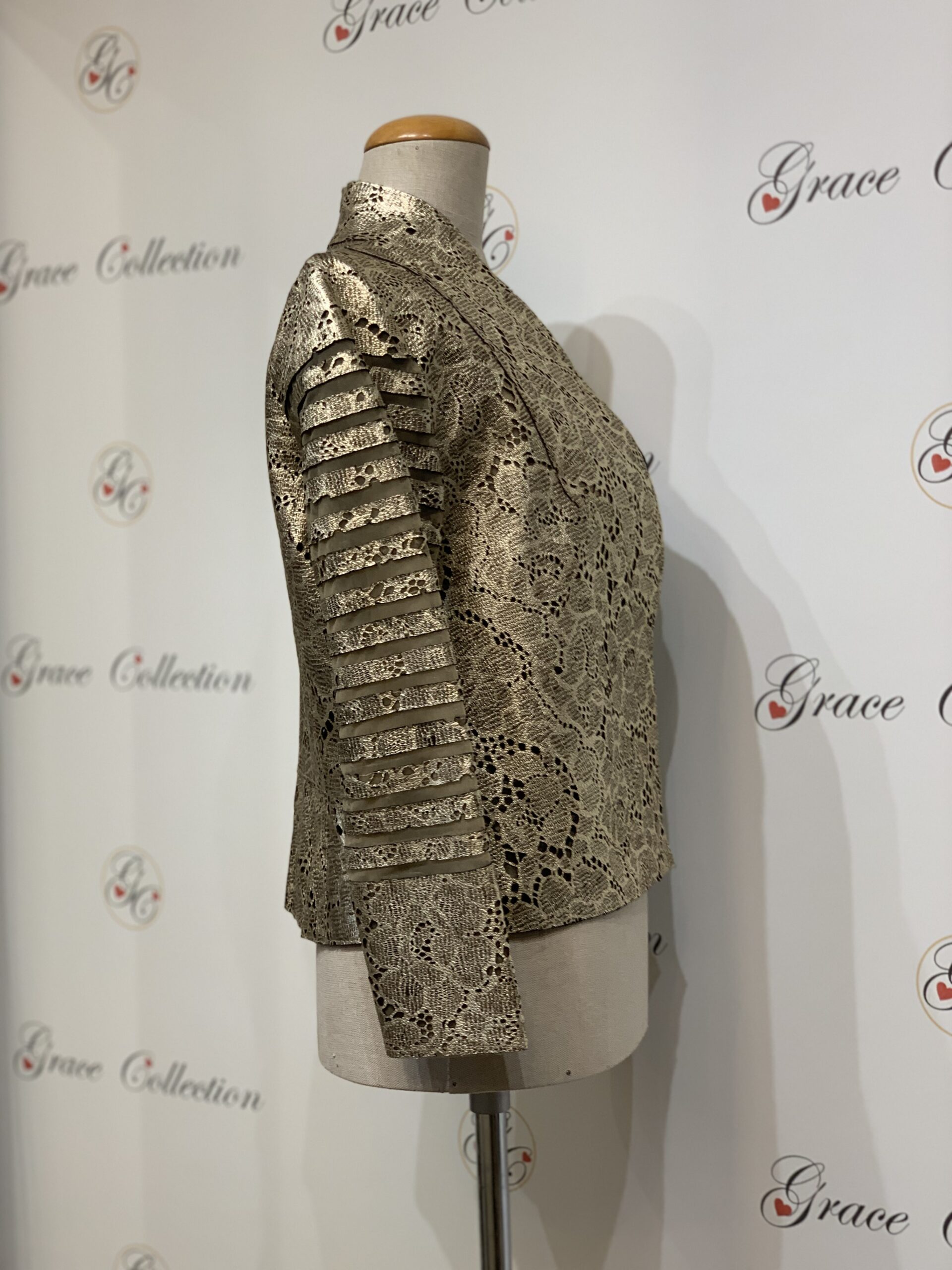 Żakiet z laserowo wycinanej skóry koronkowej w kolorze złotym, rękawy cięte w paski naszywane na siateczkę elastyczną. Przód lekko zaokrąglony przy szyi, bez zapięcia.